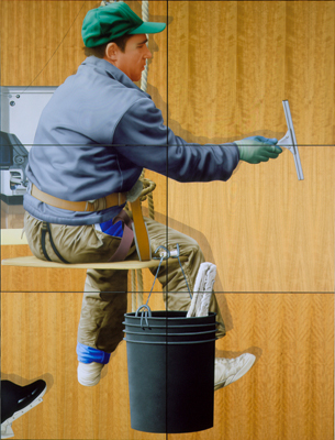 strand of hair in the mural has been individually painted on Wood panels using tiny airbrush movements. The window washer took