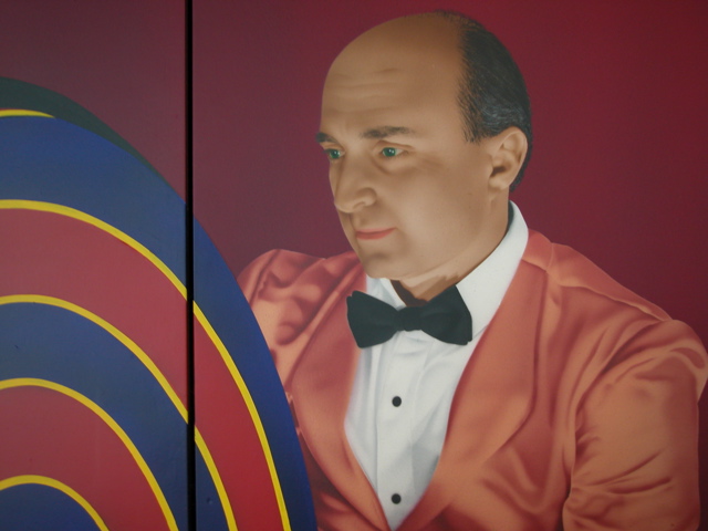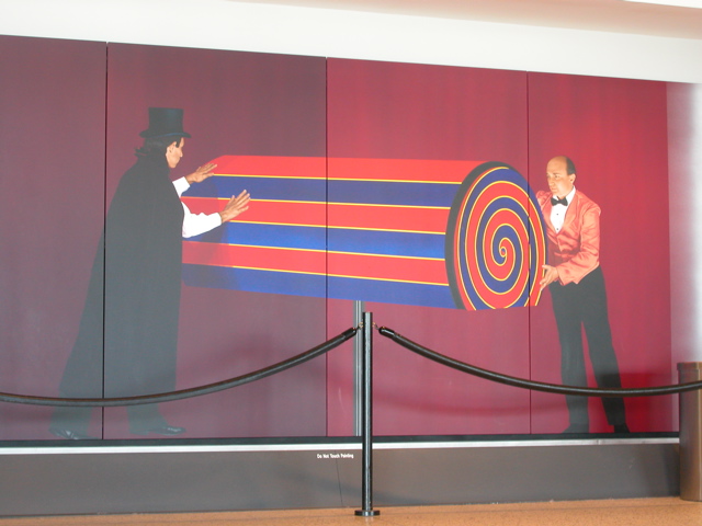 High Wire is a one-hundred-eighty-foot-long meditation on air travel and magic in Concourse D of the Seattle-Tacoma International Airport. The mural shows different stages of a vaudeville performance with eleven different sequential depictions of a magician and his assistant. Their trick involves an empty magic box out of which a woman eventually appears or, if viewed in the opposite direction, a woman who disappears in a magic box. Always committed to integrating the preexisting architectural components with the meaning of his work, Fajans designed this mural about arrivals and departures for travelers to perceive in transit. He wrote of the work, “Its spatial extension is defined by the individual passing through it.” (click here to see entire mural in scrollable images.) |